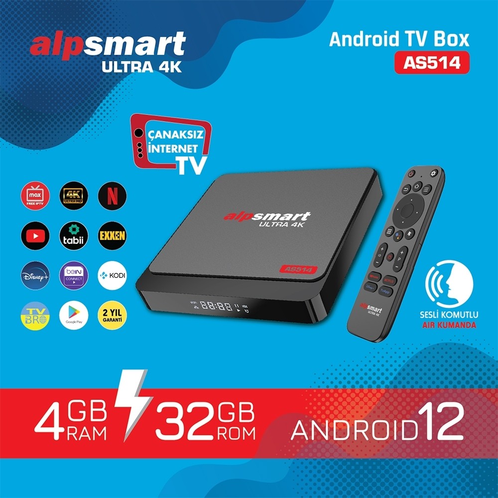 Sesli komut ve air mouse özellikli kumandası, android 12 sürümü ve yeni nesil işlemcisi ile Alpsmart AS-514 Stoklarımızlda.