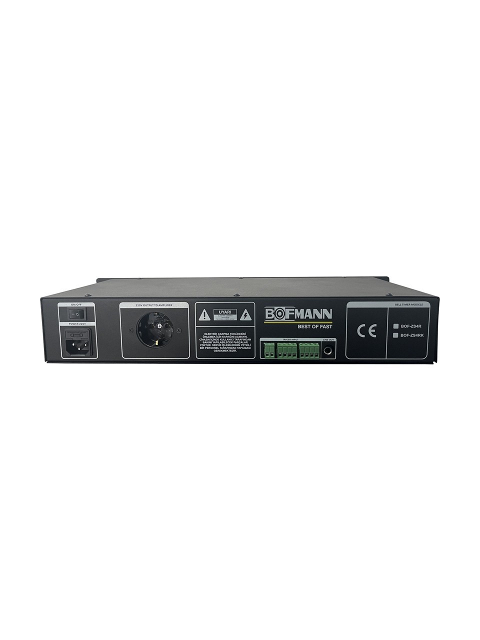 BİLGİSAYAR PROGRAMLI ACİL MESAJ ÜNİTELİ UZAKTAN KUMANDALI OKUL VE FABRİKA ZİL SAATİ Bilgisayardan programlandıktan sonra kendi başına çalışır. Zil saatleri haftanın günlerine göre bilgisayardan basit ve hızlı bir şekilde ayarlanabilir. Her ders zili için giriş ve çıkış saati girilir. Öğretmen ve öğrenciler için farklı zamanlarda farklı anons yapılabilir. Giriş ve çıkış için farklı melodiler seçilebilir. Teneffüslerde müzik çalabilir. Uzaktan kumanda ile İstiklal Marşı çalabilir. Yangın alarmı, deprem alarmı, manuel butonla İstiklal Marşı için harici olarak 4 adet ses kaydı yüklenebilir ve bu kayıtlar arkadaki 4 adet tetik girişi ile çalıştırılabilir. Teneffüs aralarında otomatik olarak çalmak için anons yüklenebilir.