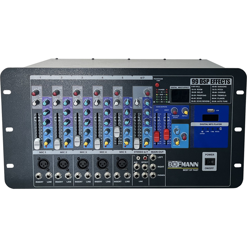 BOFMANN 7 KANAL 99 DSP REVERB’LÜ MONO/STEREO POWER KÜP MİKSER SMPS D-CLASS AMFİ RACK MONTAJ TASARIM 5 ADET MONO + 1 ADET STEREO GİRİŞ USB/U-DİSK CARD, BLUETOOTH +48 PHANTOM POWER HER KANAL İÇİN XLR, INSERT VE LİNE GİRİŞ HER KANAL İÇİN GAIN, PAN, HIGH, MID, LOW, AUX VE 99 DSP REVERB VE FADER İLE SES SEVİYE KONTROLÜ HARİCİ AUX VE EFFECT GİRİŞİ MAIN OUT (LEFT RIGHT) SİNYAL ÇIKIŞI VE MONİTÖR KULAKLIK ÇIKIŞI