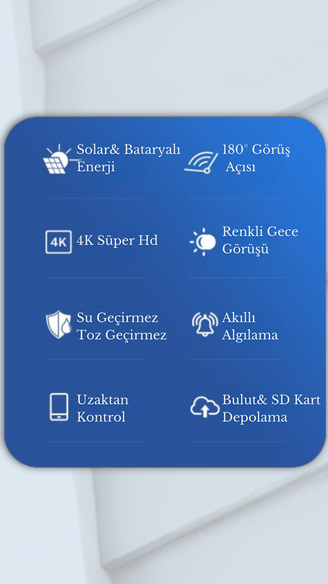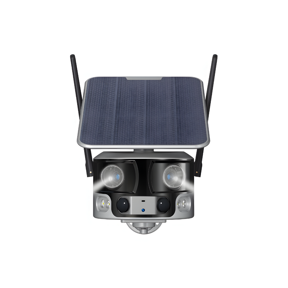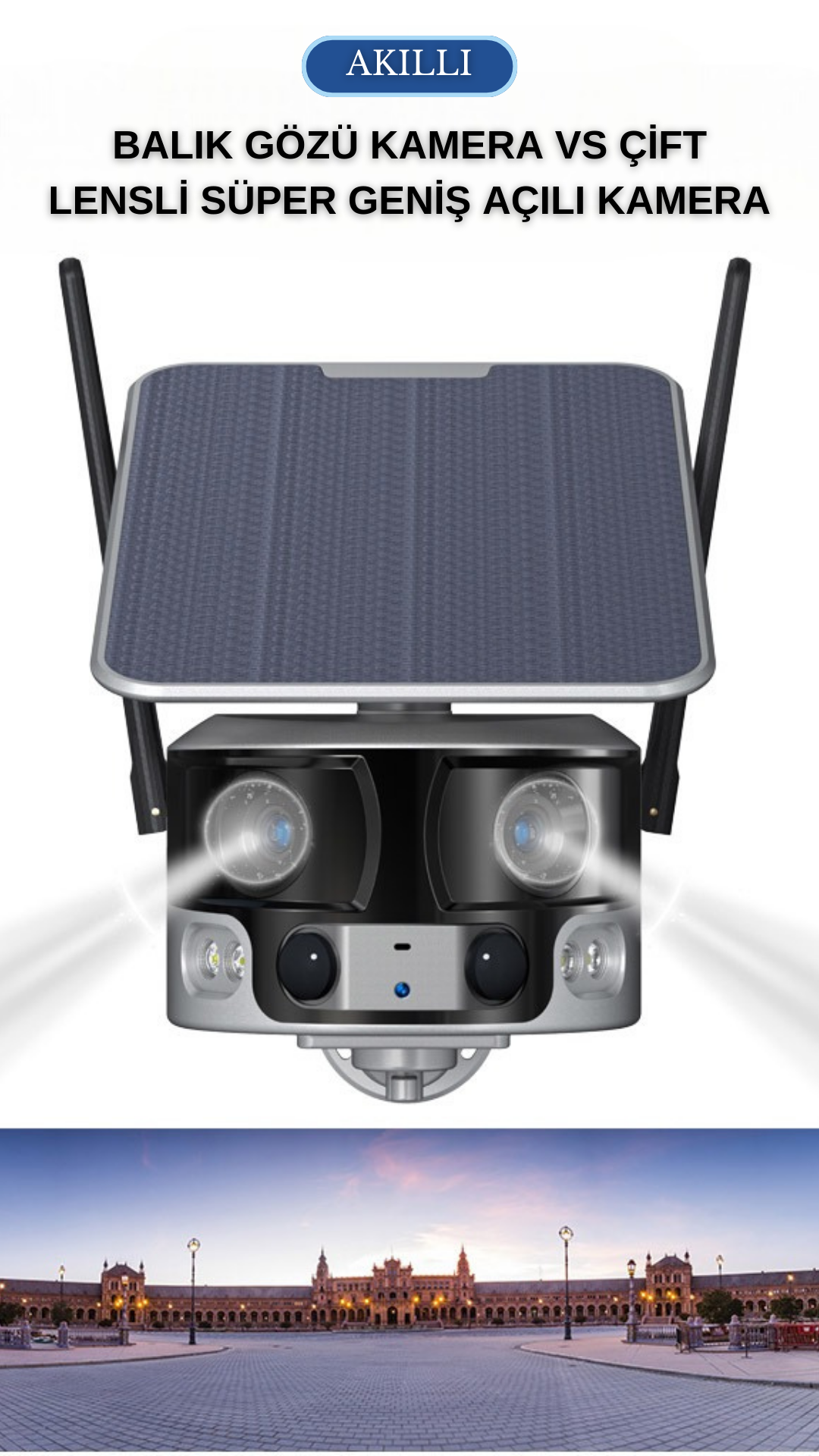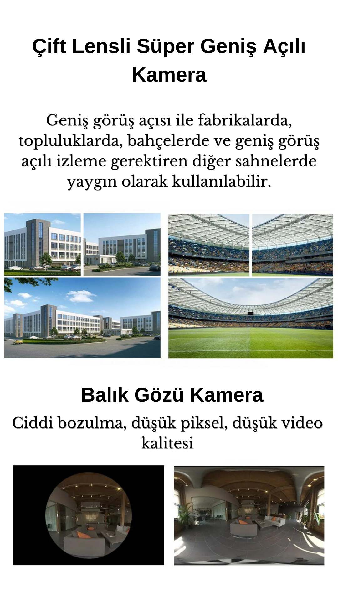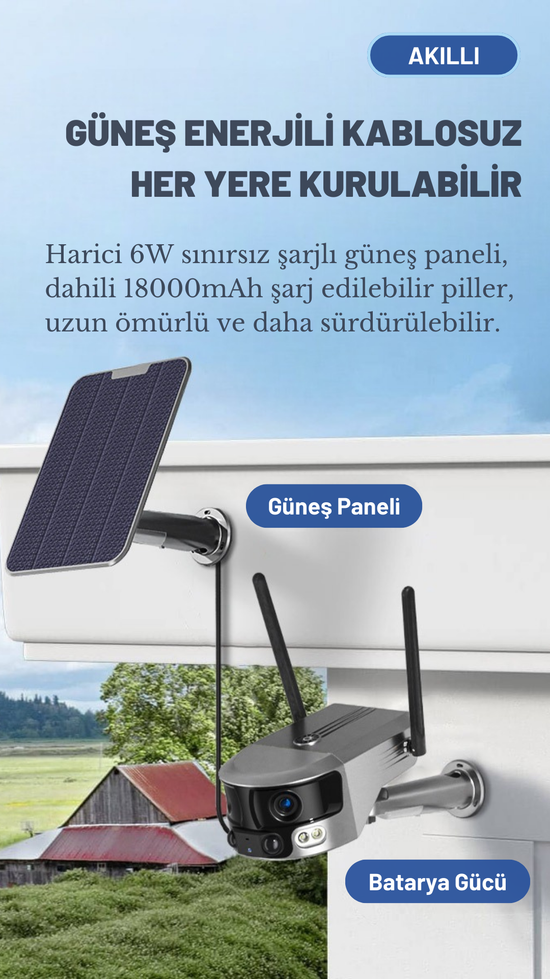 GSM şebekesinin internet hattının çektiği her noktada elektrik ve kablo bağlantısına gerek kalmadan kullanılabilir güvenlik kamerası. 180° Panaromik Çift Lensli 4K Çözünürlüklü Kamera
