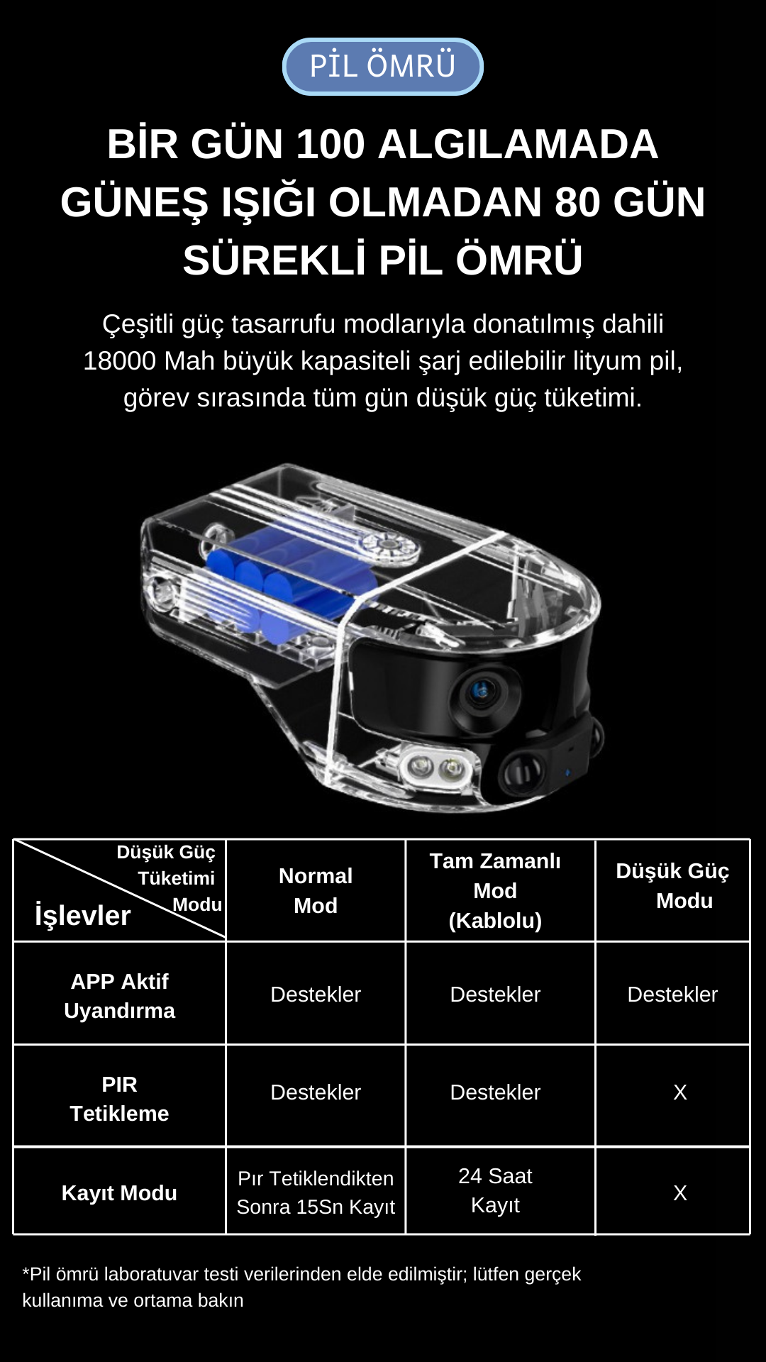 Güneş Enerjisiyle Çalışma: Güneş enerjisi panelleri sayesinde, bu kameralar güneş ışığından enerji alabilir ve pil ihtiyacını karşılayabilirler. Bu özellik, uzak bölgelerde elektrik erişiminin sınırlı olduğu durumlarda veya kablolu bir güç kaynağına erişim zor olduğunda avantaj sağlar.