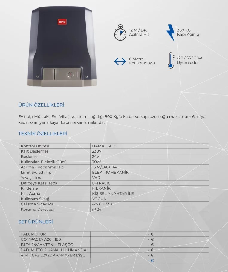 1 Adet Bft Icaro Smart Ac A2000 Otomatik Kapı Motoru 1 Takım Bft Desme Emniyet Fotoseli 1 Adet Bft Lta24 Flaşör Lamba 2 Adet Bft Mitto Kumanda 4 Metre Kremayer Dişli Çelik 30X8 Mm.