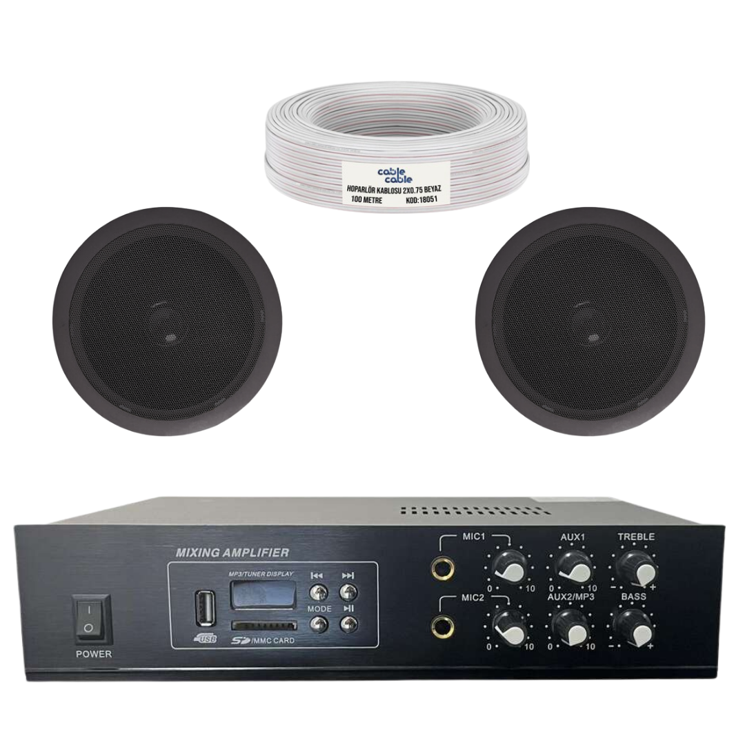 Bu paket; mağaza, ofis, kafe, okul, yönetim binası ve benzeri alanlarda temiz müzik yayını ve net anons performansı sunmak üzere hazırlanmış, tam uyumlu ve pratik bir seslendirme çözümüdür.