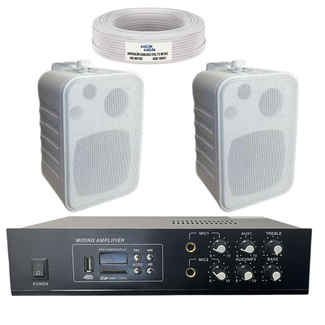 Bu seslendirme paketi; amfi, hoparlör ve gerekli bağlantı kabloları ile eksiksiz bir ses sistemi sunar. Kolay kurulumu, yüksek ses kalitesi ve uzun ömürlü bileşenleri sayesinde okul, cami, toplantı salonu, spor tesisi ve açık alan etkinlikleri gibi birçok ortamda kullanılabilir. Tek pakette profesyonel ses çözümü arayanlar için idealdir.