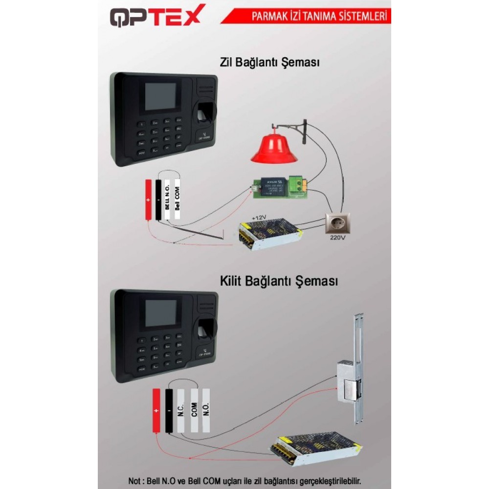 Optex OP-P1000 Parmak İzi Okuyucu 1000 Parmak /Kart / Şifre,100.000 Log, 2.4" TFT Renkli Ekran, Röle,Zil ,TCP/IP, USB, DC 12V