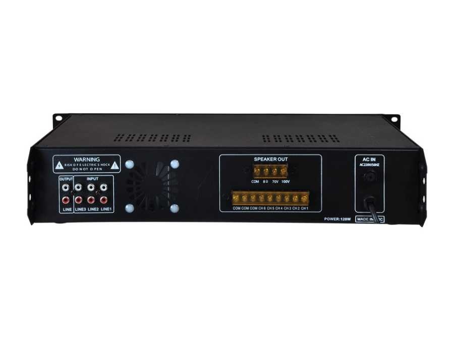 Westa WM-2120U - 6 Bölgeli 120W 100V Mixer Amfi 120W 6 Zone Mixer Amfi Çıkış değeri: 70-100 V / 8 Ohm Mic İnput: 2 Kanal (Mic 1 Priorty) Line İnput: 3 Kanal USB, SD Kart, Bluetooth, Chime, Uzaktan Kumanda, Kısa Devre Koruma, Bas, Tiz Kontrol, Telefondan Kontrol Echo, Delay, Repeat Efekt Güç: 100-240V - 50/60Hz Mic İnput: 6,3mm Mono Line İnput: 2 RCA Line Output: 2 RCA Hoparlör Çıkışı: Vidalı Klemens